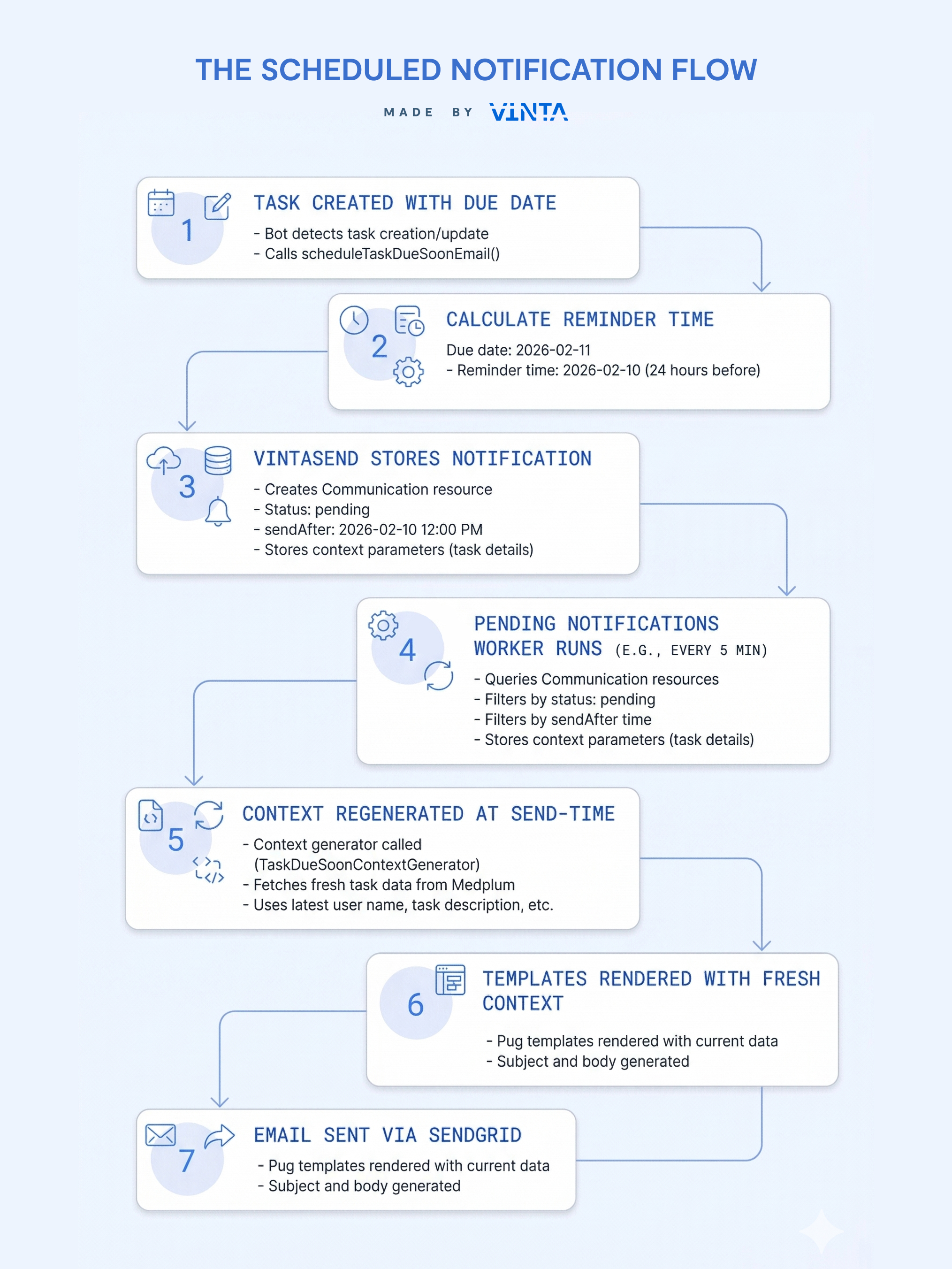 });Key Point: VintaSend will automatically send this notification at the reminderTime. The context is fetched at send-time, ensuring the email contains the most current information.